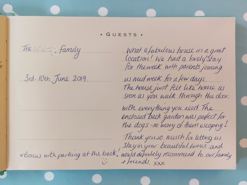 “What a fabulous house in a great location! We had a lovely stay for the week, with parents joining us mid-week for a few days. The house just felt like home as soon as you walk through the door, with everything you need. The enclosed back garden was perfect for the dogs – no worry of them escaping! Thank you so much for letting us stay in your beautiful home and I would definitely recommend to our family and friends. It’s a bonus with the parking at the back! xxx”